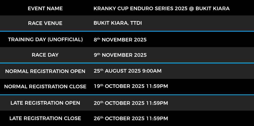 By registering and participating in the Kranky Cup @ Bukit Kiara at Kuala Lumpur, all participants are deemed to have read, understood, and agreed to abide by the official Race Rules and Regulations.
