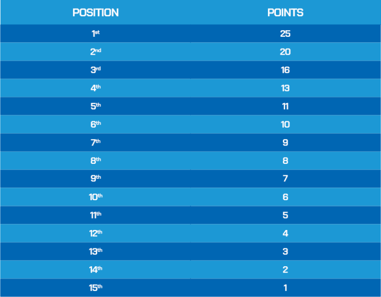 Points will be awarded to participants based on the table provided for each category.